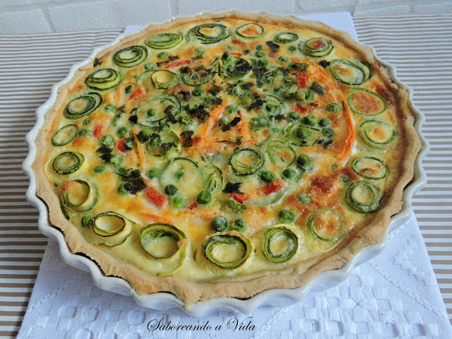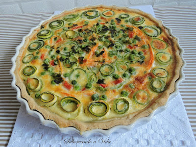 a quiche da foto era de bacalhau; a massa é a mesma da quiche de abobrinhas, e o recheio também é igual, exceto que a abobrinha foi substituída por um refogadinho de bacalhau.
