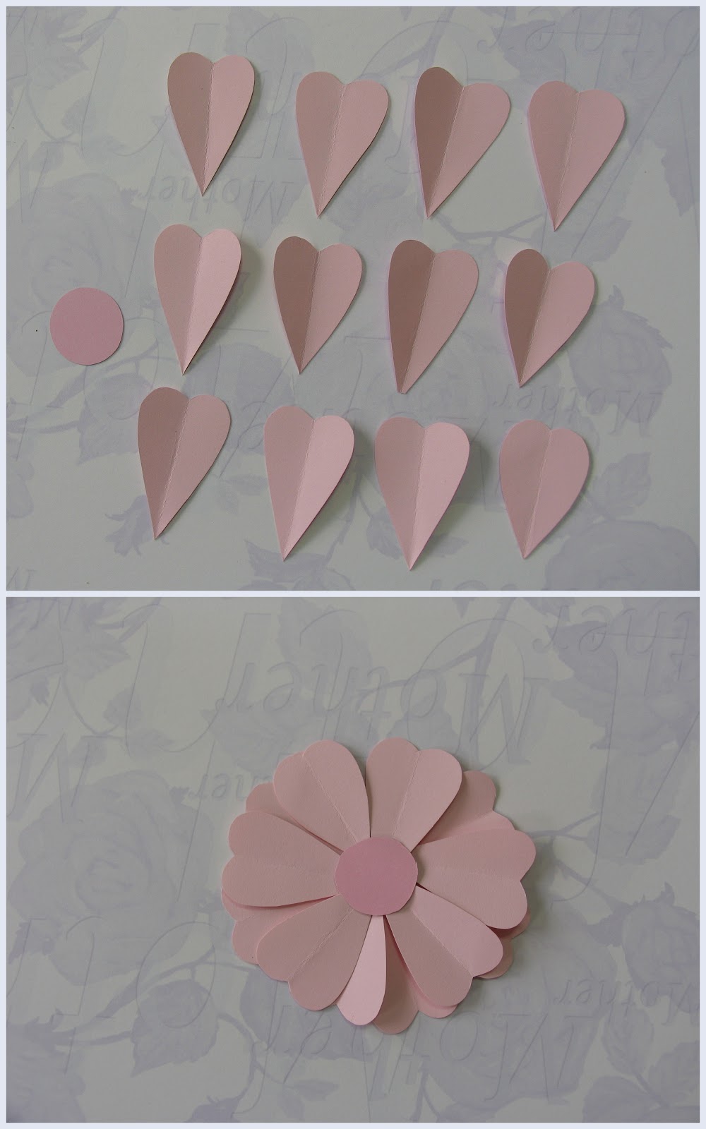 A flor é feita com doze pétalas de papel cortadas em forma de coração alongado. É preciso fazer também um círculo pequeno, que será o 'miolo' da flor. É nele que as pétalas serão coladas. As pétalas podem ser do mesmo tamanho ou de tamanho diferentes - seis maiores e seis menores. Os coraçõezinhos são dobrados ao meio, para dar um efeito mais trimensional à flor. O papel ideal para fazer esta flor tem de ser meio firme (não muito!). Se a flor for feita com corações de tamanho diferente, os menores têm de ser colados à frente e os maiores atrás destes.