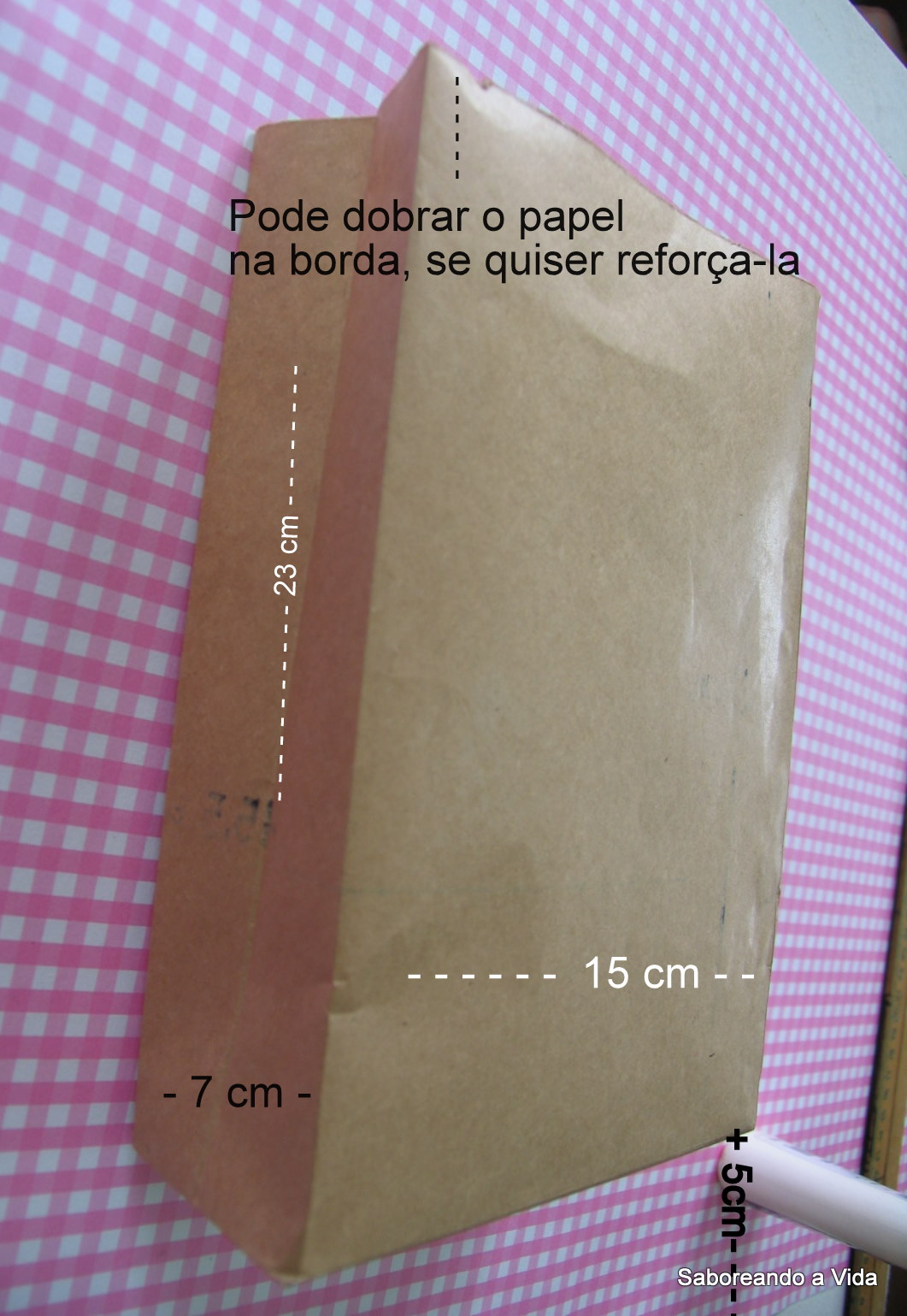 Esta é uma sacola pequena, daquelas próprias para levar objetos pequenos (por exemplo: alguns CDs/DVDs, livro, caixas de perfume ... deu para entender, né? rsrs). Mas é um bom começo para iniciar a confecção de sacolas. O papel escolhido deve ser resistente, mas, dependendo do peso a ser carregado, ele pode ser mais delicado. Eu usei um papel um pouco mais mole do que cartolina e dupla face, para dar um charme, rsrs. Cortei um pedaço do papel de 45,5 cm de largura por 28cm de altura e aí dobrei o papel nas dimensões indicadas na foto. Observe que o fundo é feito com os 5 centímetros que são indicados na foto e não aparecem, pois já foi dobrado e colado:
