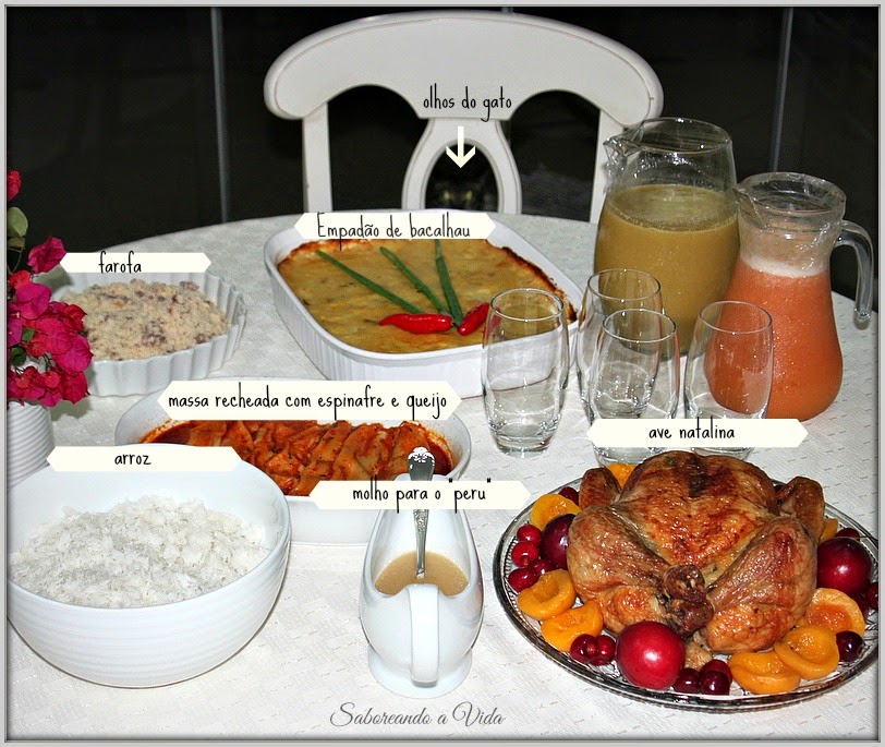 Arroz branco; farofa natalina; empadão de bacalhau com massa de batatas (é praticamente igual a um escondidinho de bacalhau feito com purê de batatas); massa recheada (era simplesmente umas "panquecas" feitas com massa fresca de lasanha - comprada no supermercado - que recheei com espinafre refogadinho e queijo tipo muçarela - comprado já fatiado para este fim -, depois de rechear e enrolar as "panquecas", cobri tudo com molho de tomate caseiro e levei o pirex ao forno, para que o queijo derretesse); tivemos também um Chester (que é a ave natalina) e uma rica salada, que não aparece na foto, mas que era constituída de dois tipos de alface: crespa e roxa, agrião, dois tipos de tomate: em rama e sweet grape e amêndoas. Estava tudo delicioso!
